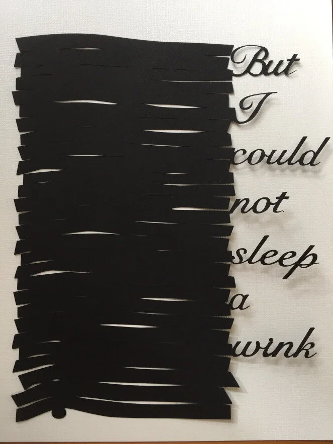 This cutting took three drafts. On the first one, the connections between letters were far too thin, and they all fell apart. In the second version, a few were still too thin, and other parts of the design shredded under the knife. I cut the final version out of my new Canson Mi-Teintes paper, and it came out beautifully. I'd been looking for a new paper to work with for a while, and I might have found it.